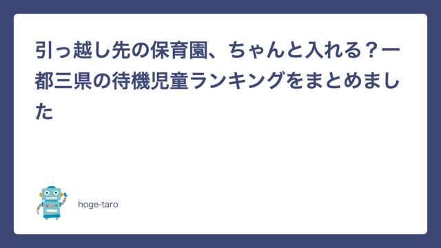 住まい 引っ越し先の保育園、ちゃんと入れる?一都三県の待機児童ランキングをまとめました 2026年2月26日 hoge-taro 「そろそろ都内の賃貸、限界かも…」「マンション売って郊外に引っ越したいけど、保育園って大丈夫?」 共働きで子育て中のご家庭にとって、 …