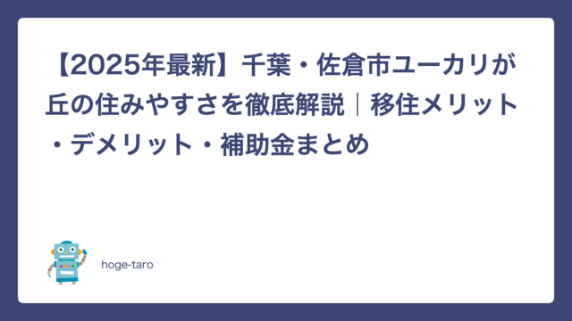 住まい 千葉移住するなら佐倉市ユーカリが丘一択?移住支援・補助金・子育て環境を全部まとめた【2025年最新】 2026年2月27日 hoge-taro 🌸 都内の家賃や物価に疲れて「千葉への移住」を考え始めた方、こんにちは!この記事では、千葉県佐倉市、特にユーカリが丘エリアへの移住を徹底解 …