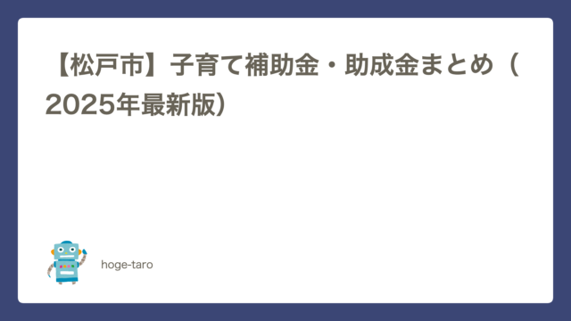 住まい 【松戸市】子育て補助金・助成金まとめ(2025年最新版) 2026年3月7日 hoge-taro 「松戸市住みやすいって聞くけど、子育て支援とか実際どんな補助金・助成金があるの?」 そう思って調べても、市のホームページはページが多 …