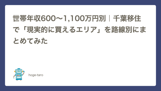 住まい 世帯年収600〜1,100万円別|千葉移住で「現実的に買えるエリア」を路線別にまとめてみた 2026年3月22日 hoge-taro 「千葉に移住したいけど、どのエリアが自分たちの予算に合うのかわからない」——そう悩んでいませんか? YouTube やブログで「千葉 …