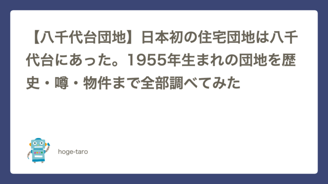 住まい 【八千代台団地】日本初の住宅団地は八千代台にあった。1955年生まれの団地を歴史・噂・物件まで全部調べてみた 2026年3月22日 hoge-taro 「日本で最初に住宅団地が生まれた場所が千葉にある」——そう聞いてもピンとこない方も多いと思います。でも、それは紛れもない事実で、その場所が …