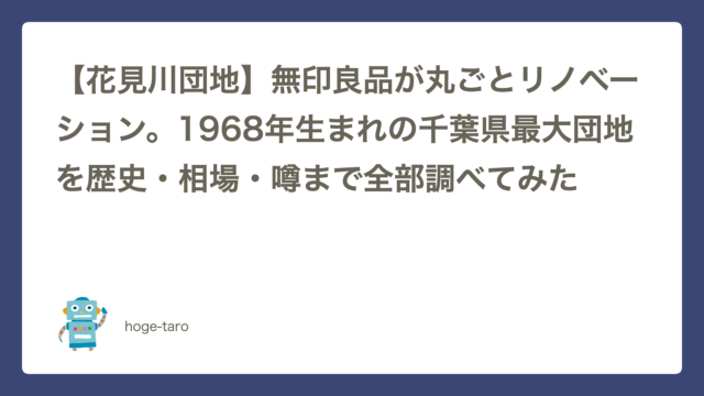 住まい 【花見川団地】無印良品が丸ごとリノベーション。1968年生まれの千葉県最大団地を歴史・相場・噂まで全部調べてみた 2026年3月22日 hoge-taro 「都内の家賃が高すぎて限界…でも引っ越し先がまったくわからない」——そんな悩みを抱えてこの記事を開いてくれた方、めちゃくちゃよくわかります …
