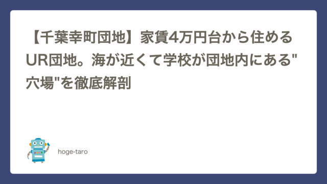 住まい 【千葉幸町団地】家賃4万円台から住めるUR団地。海が近くて学校が団地内にある"穴場"を徹底解剖 2026年3月22日 hoge-taro 「東京湾の上に建っている団地がある」——そう聞いてもピンとこない方が多いと思います。でも、これは紛れもない事実なんです。 都内の家賃 …