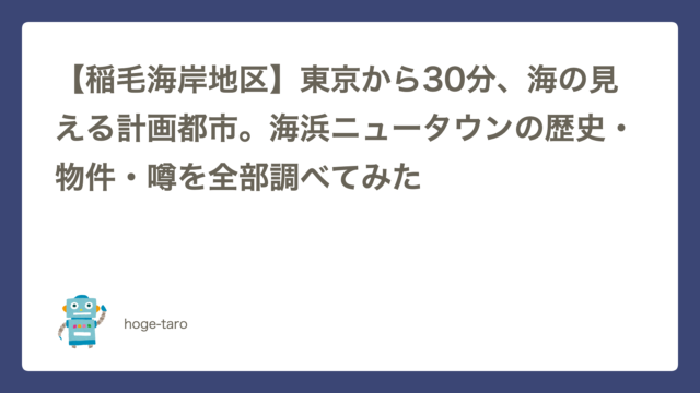 住まい 【稲毛海岸地区】東京から30分、海の見える計画都市。海浜ニュータウンの歴史・物件・噂を全部調べてみた 2026年3月22日 hoge-taro 「東京から30分で、海の見える計画都市に住める」——そう聞いても、なかなかリアルにピンとこないですよね。でも、それが千葉市美浜区・稲毛海岸 …