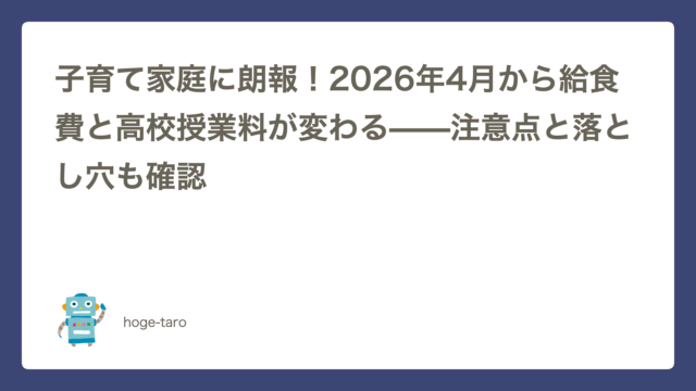 住まい 子育て家庭に朗報!2026年4月から給食費と高校授業料が変わる——注意点と落とし穴も確認 2026年3月30日 hoge-taro /* ===== RESET & BASE ===== */ #kkmk-root * { box-sizing: bo …
