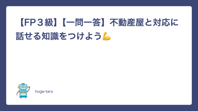 ライフハック 【FP3級】【一問一答】不動産屋と対応に話せる知識をつけよう💪 2026年2月26日 hoge-taro FP三級程度の知識が手っ取り早く確認できるテストを作成してみました。自分がどの程度の知識があるかぜひトライしてみてください!50問がランダ …