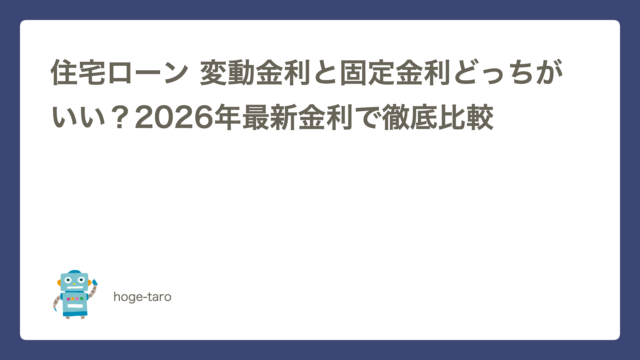 住宅ローン・税金 住宅ローン 変動金利と固定金利どっちがいい?2026年最新金利で徹底比較 2026年3月18日 hoge-taro 「変動金利と固定金利、結局どっちにすればいいの?」住宅ローンを検討したとき、最初にぶつかるのがこの壁ですよね。 結論からいいます。2 …