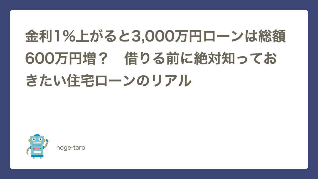 結論から言います。金利が1%上がっただけで、3,000万円のローンなら総返済額が約600万円増え、1億円のローンなら約2,000万円増えます。毎月の返済額に換算すると、家計への影響は「ちょっと苦しい」どころじゃないんです。