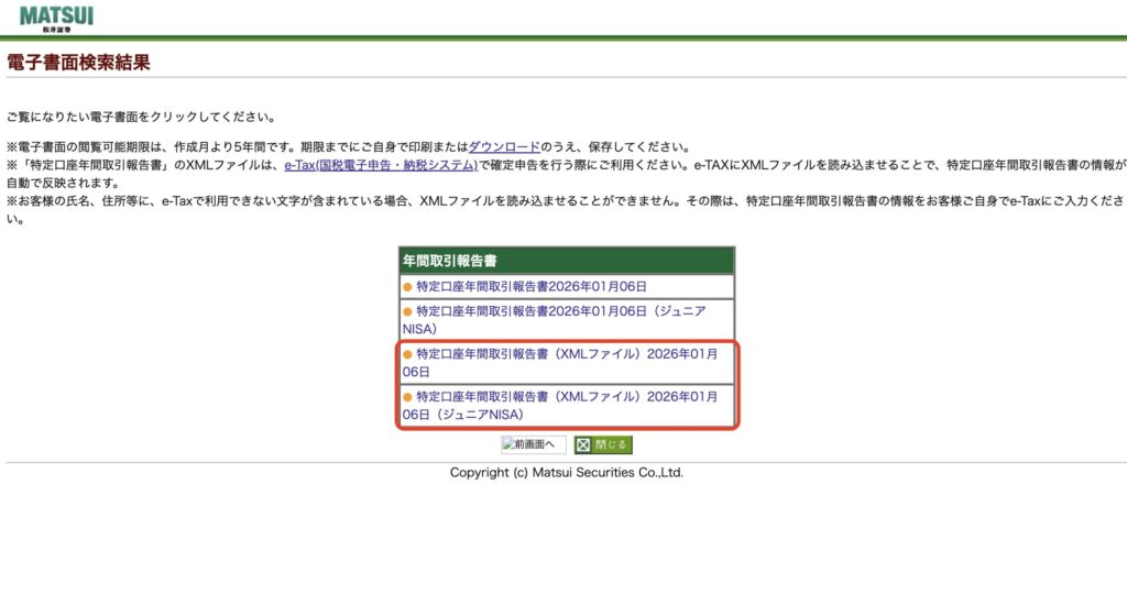 ① 証券会社で「特定口座年間取引報告書(XML)」をダウンロード