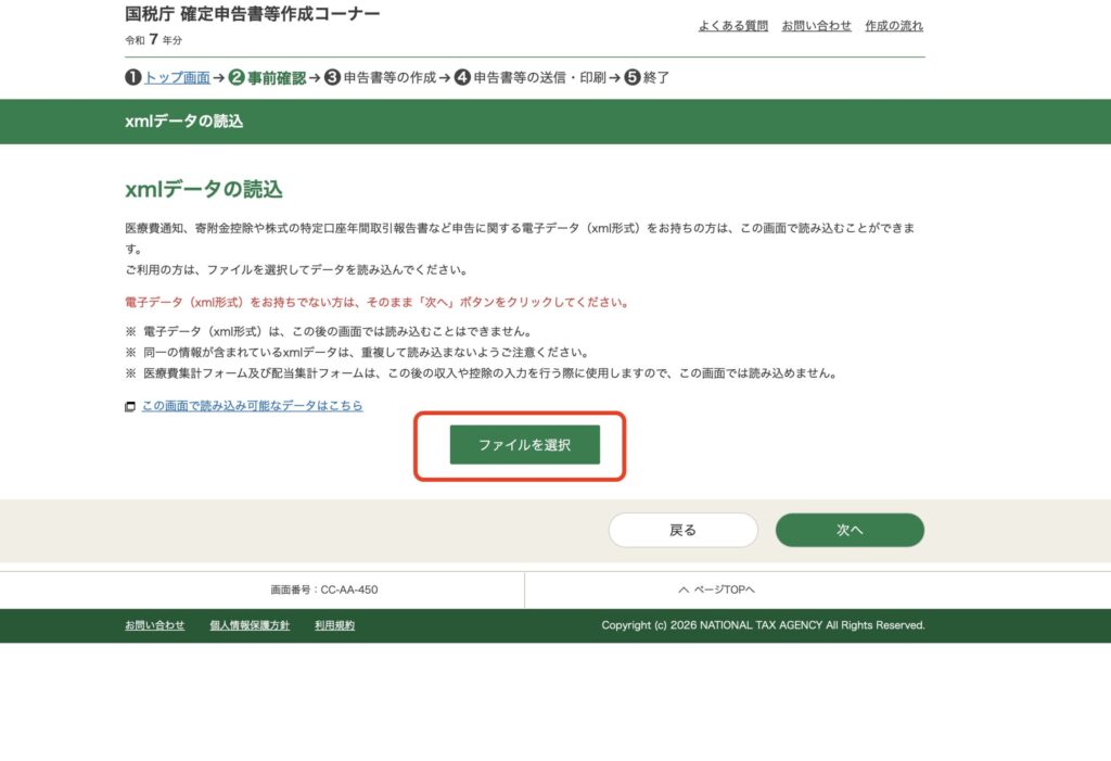 ここの画面で先ほど証券口座からダウンロードしたXMLファイルを選択します