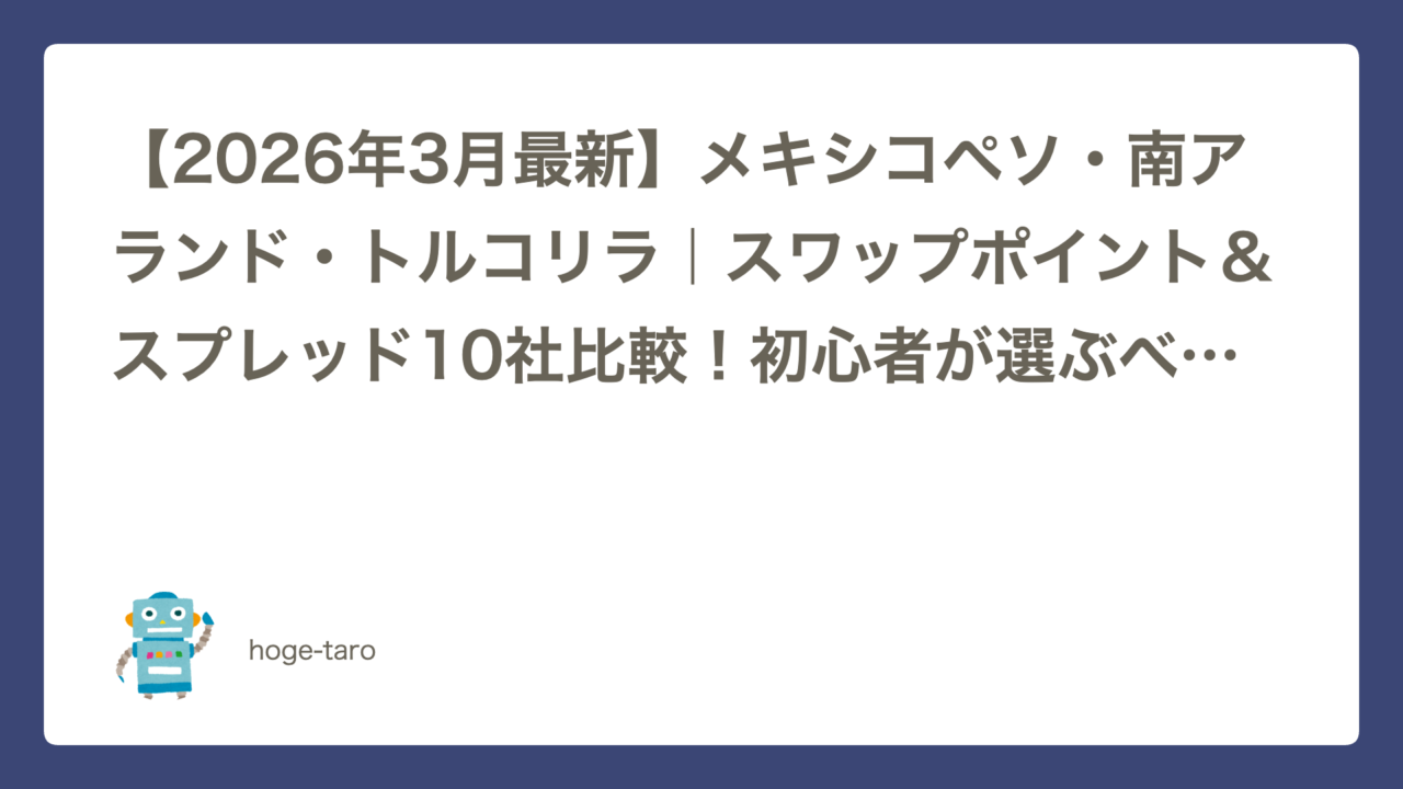 ただし注意点もあります。米国のトランプ政権による関税政策の影響を受けやすく、2026年に予定されるUSMCA再協議の結果次第では急落のリスクもゼロではありません。メキシコ中銀は利下げ方向に動いており、今後スワップポイントが徐々に減っていく可能性も頭に入れておきましょう。