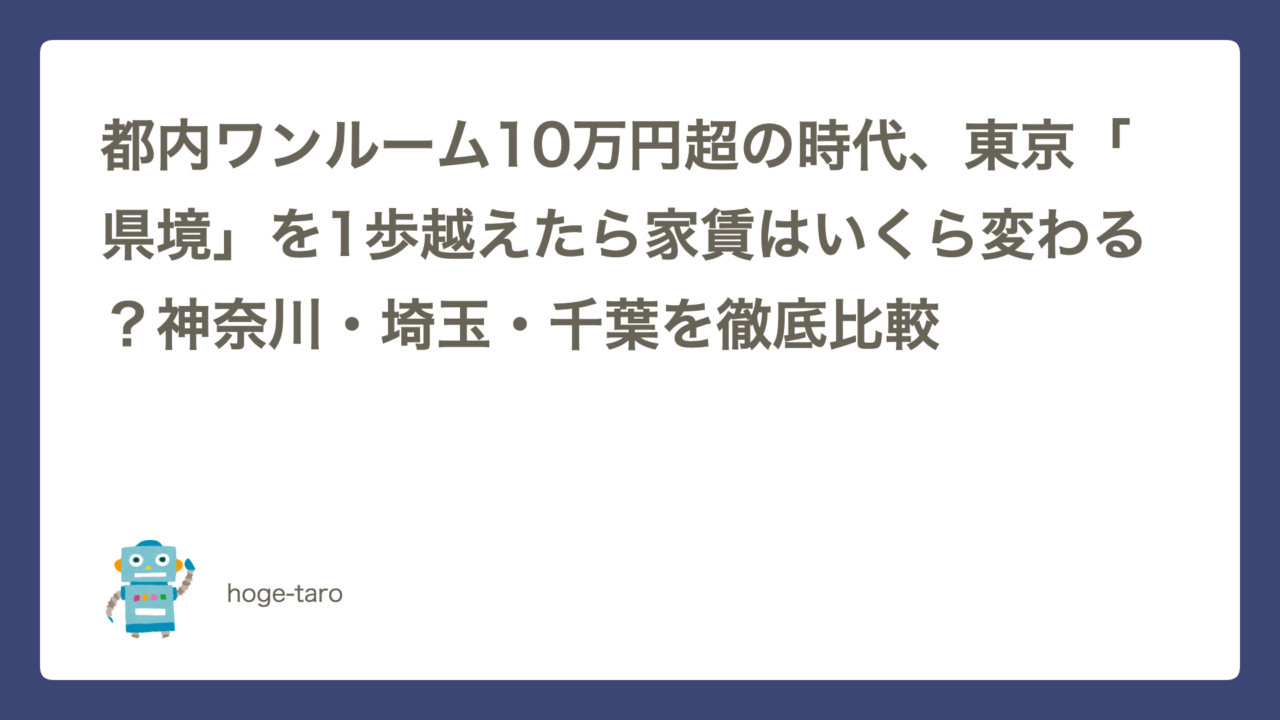 「神奈川・埼玉・千葉に引っ越せば安くなる」とよく言われますが、どのくらい安くなるのか、具体的な数字で見たことがある人は意外と少ないはず。「雰囲気で知ってる」から「数字で知ってる」に変えることで、引っ越しという判断が現実的になります。